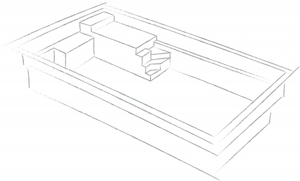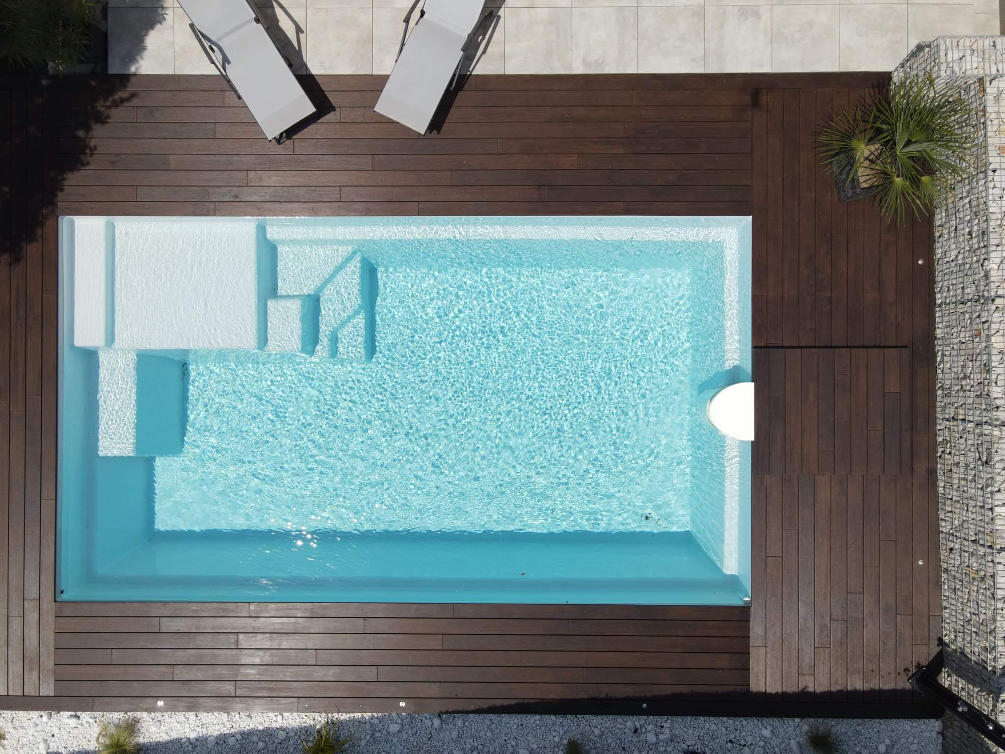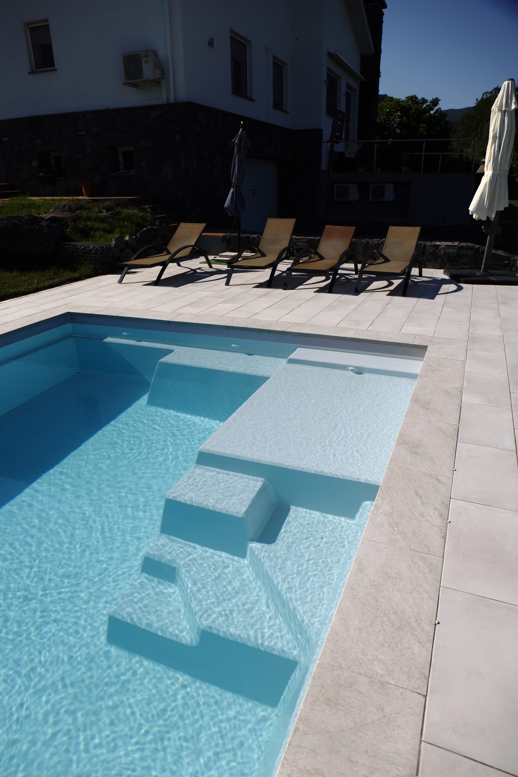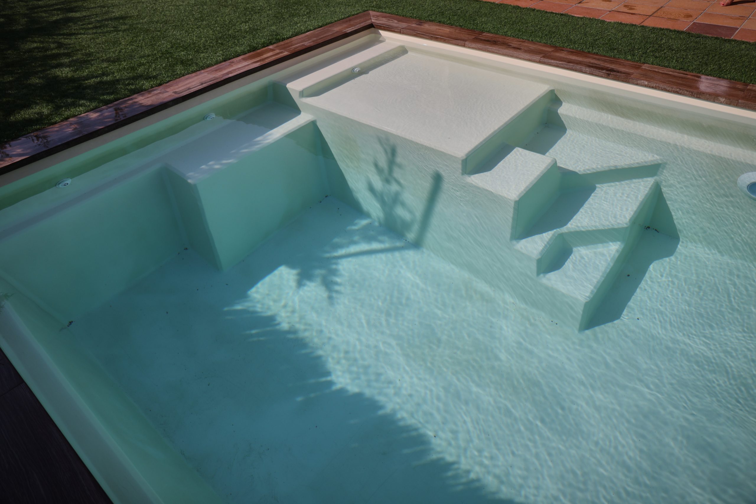Peldaño de seguridad en la totalidad del perímetro de la piscina, para facilitar la entrada y salida en la piscina.