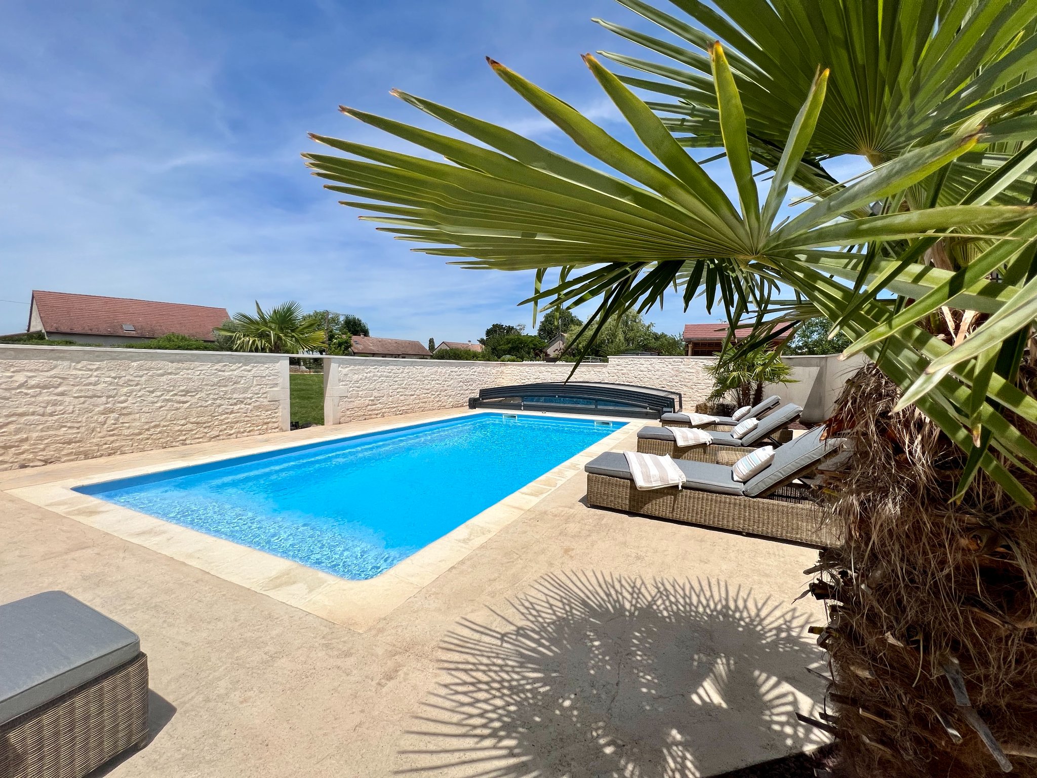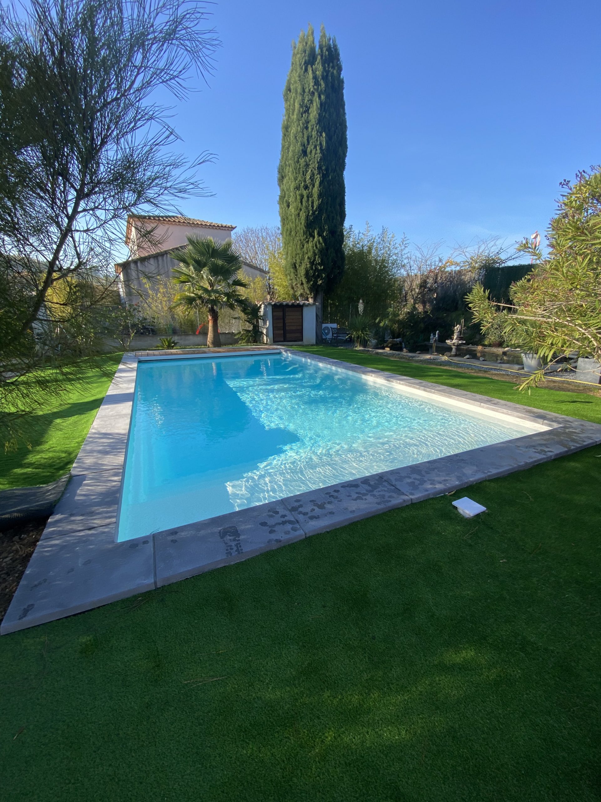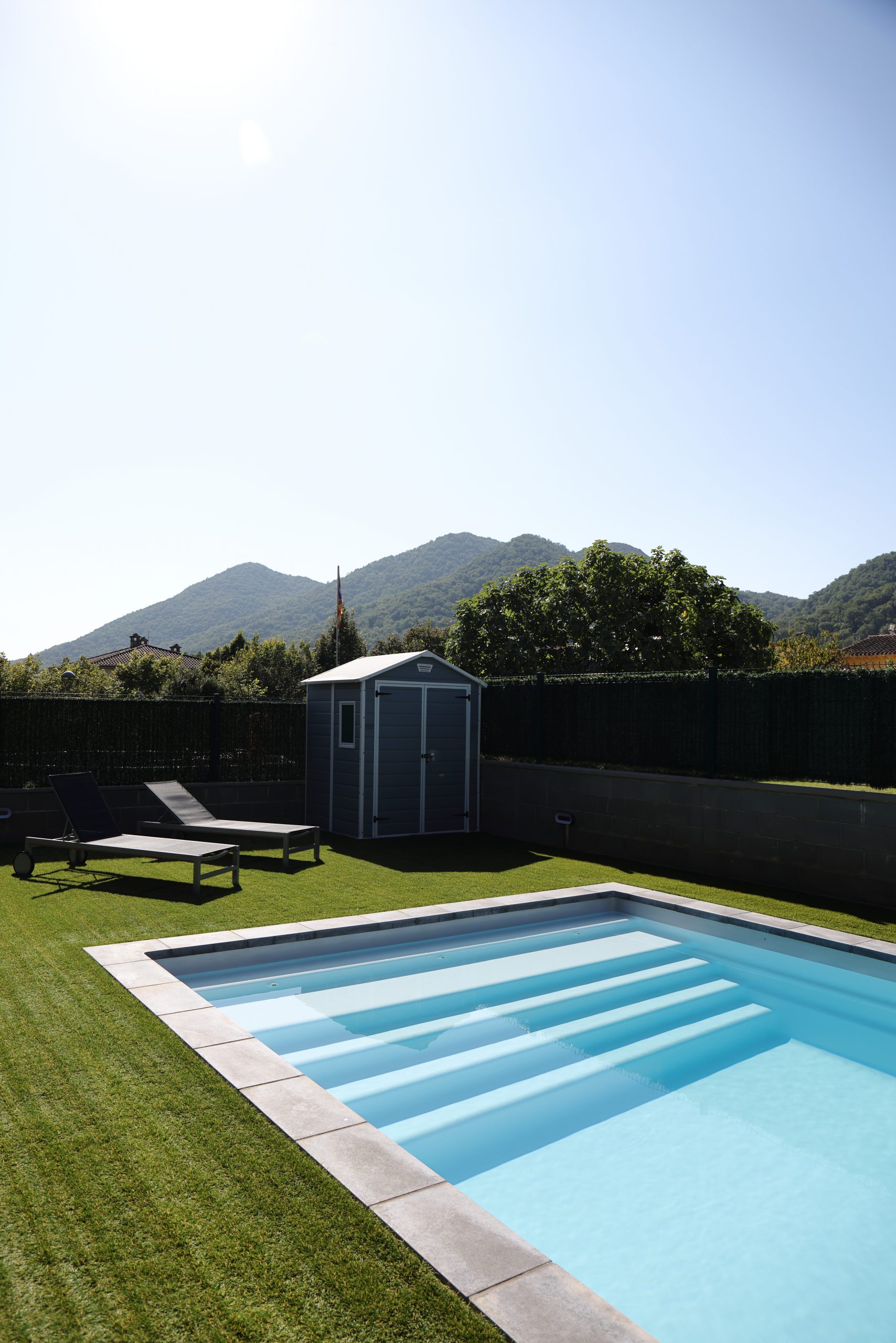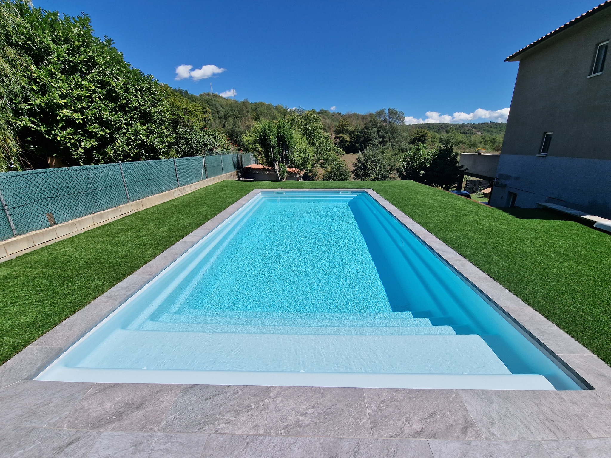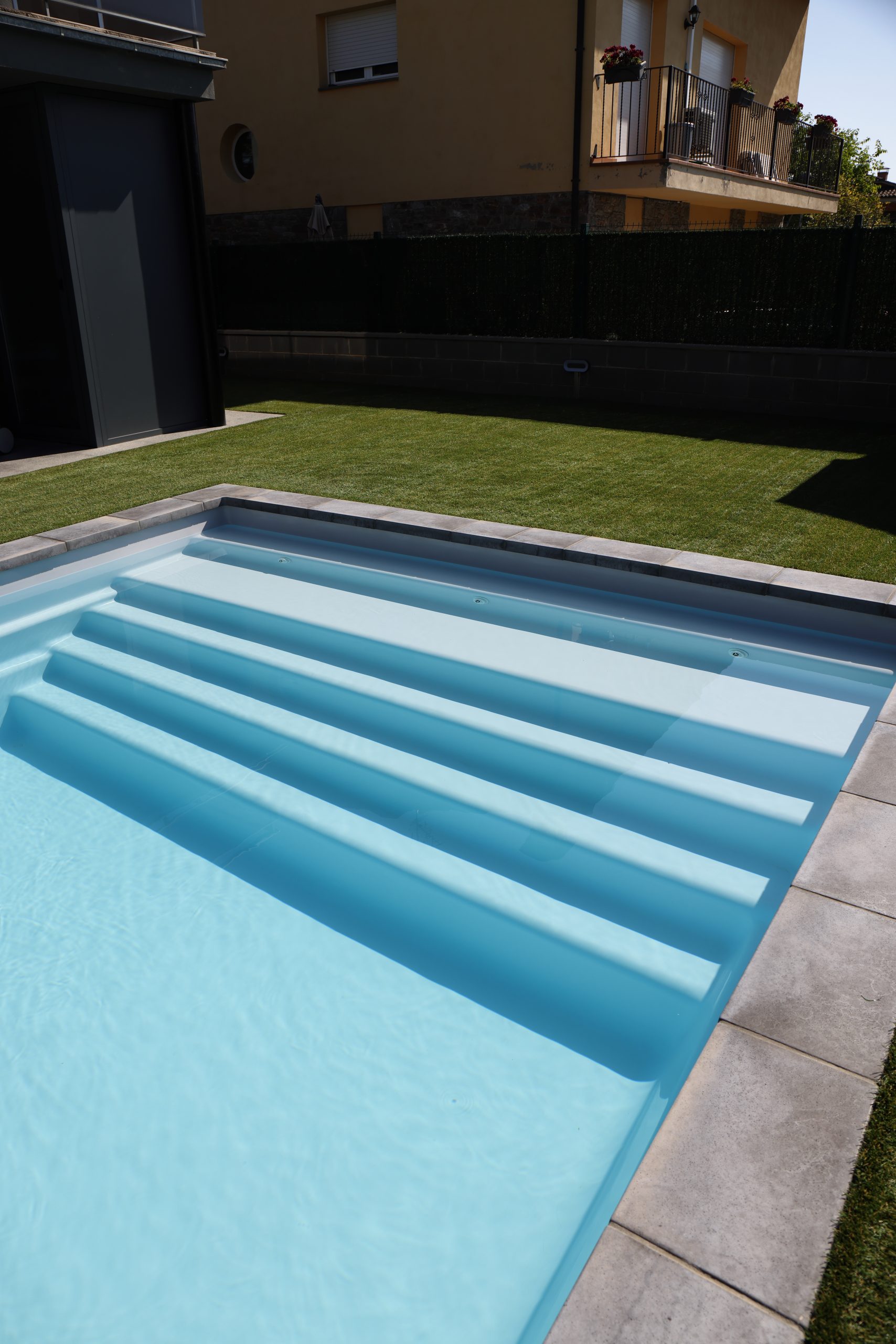 Escalera antiderrapante en la totalidad de su anchura permite acceder fácilmente y con toda seguridad a la piscina.